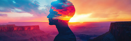 A man's silhouette is filled with an artistic blend of colors from a stunning sunset reflecting over a vast canyon. The atmosphere evokes peace and tranquility during twilight.