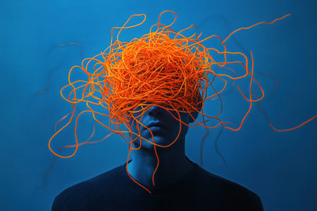Creative portrait of a person with an orange tangled hair like design against a deep blue background, symbolizing chaos, confusion, and creativity