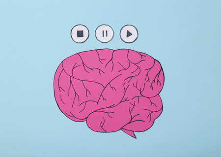 Brain with icons start, stop, pause of media player on pink background. top view
