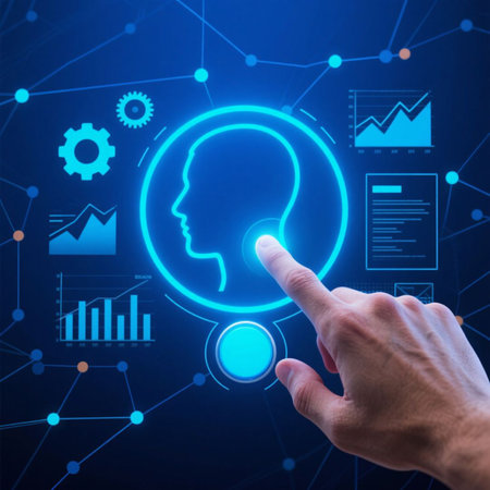 Hand engaging with digital interface featuring advanced 3d facial recognition on modern display