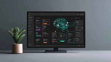 A modern computer monitor showcases a sophisticated data visualization interface, set against a sleek background with a stylish plant, creating a contemporary workspace.