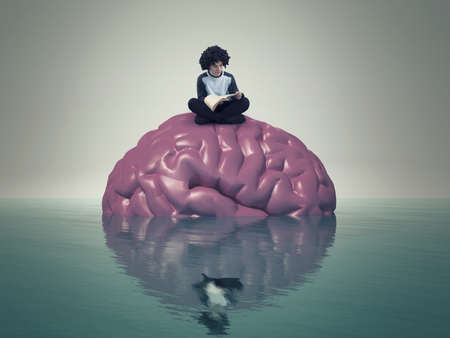 A brain is floating above an open book. The brain is pink and white, and it is surrounded by a blue and orange background. Concept of curiosity and wonder