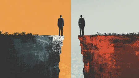 Two figures stand on opposite edges of cliffs, one side representing long-term vision and the other showing short-term gain in a business context.