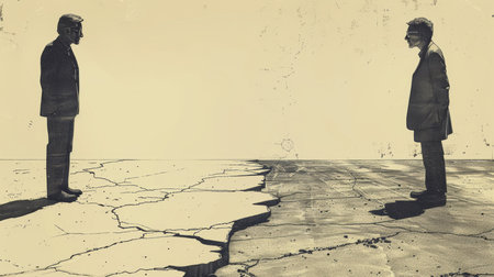 Two men from different eras confront each other across a cracked terrain, symbolizing a clash of times and ideologies in a stylized artistic depiction.