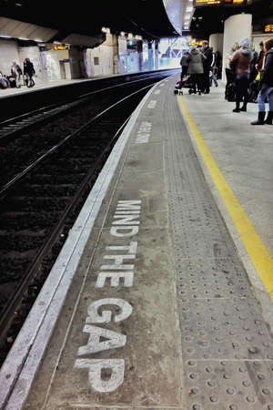 Close-up of Mind the Gap warning text on a train station platform near railway tracks. Travel safety reminder in the UK transportation system.