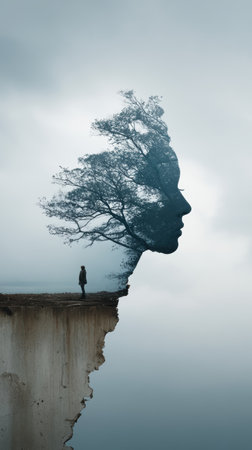 A lone figure stands on cliff with tree forming face silhouette