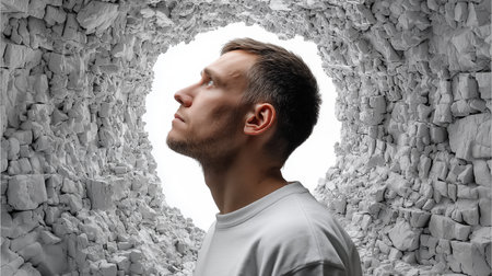 Young man looking through a hole in a stone wall. Conceptual image.