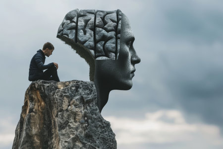 This striking image showcases a conceptual brain model with colorful sections surrounded by building blocks and sand, symbolizing human growth and struggle.