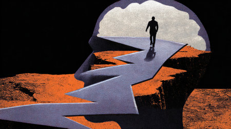 A solitary figure stands at the edge of a vast abyss against a dramatic sky, symbolizing uncertainty and the challenges one faces in life. This image evokes reflection and contemplation.