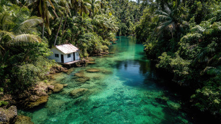 A peaceful tropical river flows through lush greenery, showcasing a small house at the water's edge. The stunning blue water reflects the sunlight, creating an idyllic natural scene.