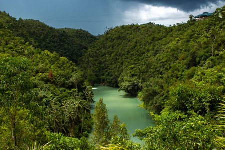 Tropical landscape in sunny weather. Village by the river. Green hills and river. Summer and travel vacation concept. The nature of the Philippine Islands, Samar
