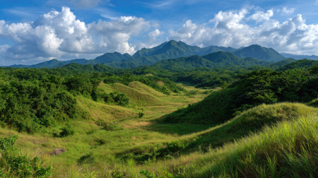 Vew Mountains with rainforest covered with green vegetation and trees on the tropical island, landscape. Mountains and hills with wild forest, sky clouds. Hillside rainforest and jungle. Philippines, Bohol .