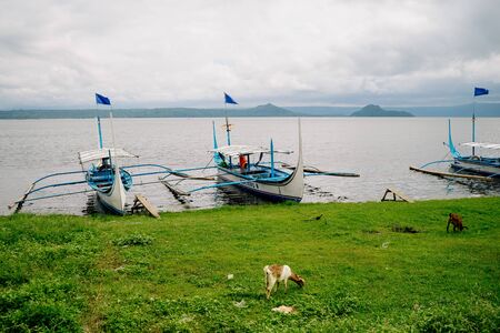 Phishing boat on a shore of beautiful Lake Taal, Philippines. Landscape of Luzon Island with volcano on the lake that changed the area geometry a few centuries ago. Dec 2018, Philippines