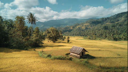 A breathtaking view of a rice field landscape featuring a quaint wooden house surrounded by lush greenery and majestic mountains under a clear blue sky.