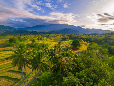 Beautiful morning view indonesia Panorama Landscape paddy fields with beauty color and sky natural light