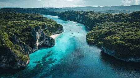 A stunning aerial view of a tropical island with boats floating in the crystalclear water, surrounded by lush greenery and palm trees AIG50