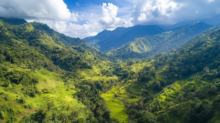 Top view of rice terraces in scenic valley on Bali. Mountain landscape with rice fields. Aerial view