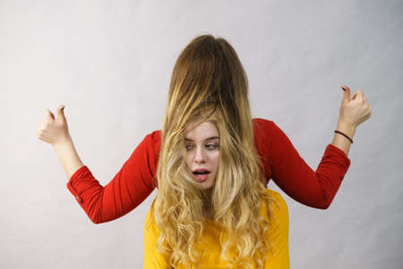 Woman playing with her female friend long ombre color hair. Different hairdo colors, haircare and hairstyling.