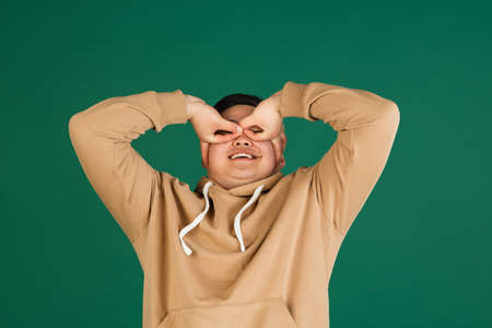 Asian mans portrait isolated over green studio background with copyspace