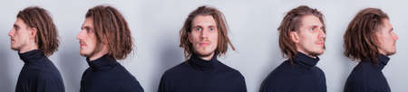 Set collage man in dark gray turtleneck and short dreadlocks on head standing on gray background. Different angle view of a young man face.