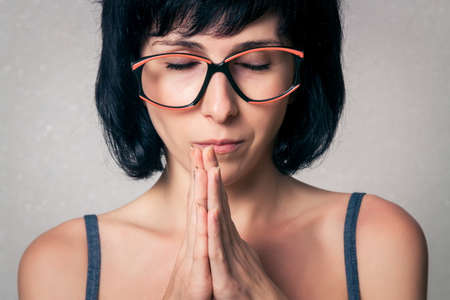 Man praying. Concentrated young man in white shirt holding hands clasped near face while standing against grey background