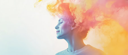 A serene woman breathes out fluffy clouds, symbolizing imagination and tranquility. This artistic portrayal captures beauty and peacefulness in a dreamy atmosphere.