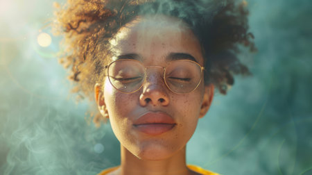 Portrait of a beautiful young African American woman with curly hair, eyeglasses, closed eyes, and plump lips on a smoky textured blue background. Serene and elegant beauty concept