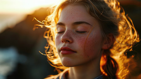 Scandinavian teenage girl meditates with her eyes closed, exposing her face to the sea breeze