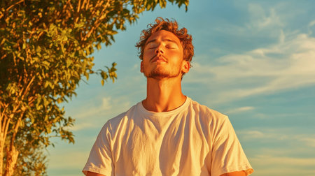 Serene male enjoying fresh air outdoors, basking in sunlight and embracing vitality and tranquility