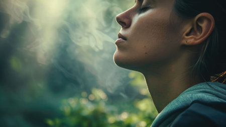 A close-up profile of a woman exhaling smoke against a dark background, with the light emphasizing the texture and movement of the smoke in a dramatic and artistic composition.
