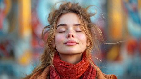 A woman stands outside with her eyes closed and a slight smile on her face. She seems to be enjoying the fresh air and sunlight in a natural setting. Her hair flows in the wind.