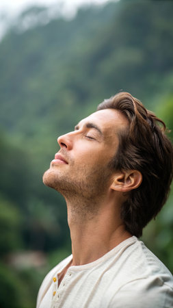 Serene male enjoying fresh air outdoors, basking in sunlight and embracing vitality and tranquility