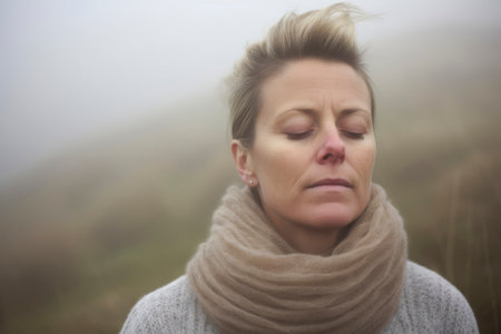 A woman stands by the water, eyes closed and face relaxed, soaking in the calmness of a foggy morning. Her soft features and gentle expression reflect tranquility and peace.