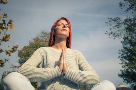 Practicing Yoga with eyes closed in nature. Young woman with hands clasped doing relaxation breathing exercise against the sky.