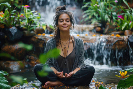 A serene individual is meditating in a stunning natural environment, surrounded by lush greenery. This peaceful scene captures the essence of mindfulness and tranquility, ideal for promoting wellness and relaxation themes.