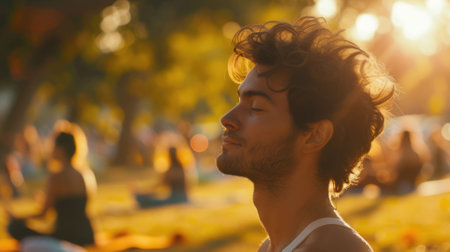 The picture of the person is meditating at the park with calm under the bright light of the sun, the meditation require skill like focus, relaxation, patience, compassion, and self awareness. AIG43.