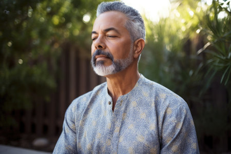 Elderly man in contemplative yoga pose surrounded by peaceful forest and soft,rejuvenating morning light. Serene,spiritual and rejuvenating scene of wellness and harmony with nature.