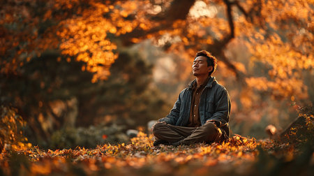 Autumn Serenity. Man meditating in a sunlit autumn forest with vibrant orange leaves.