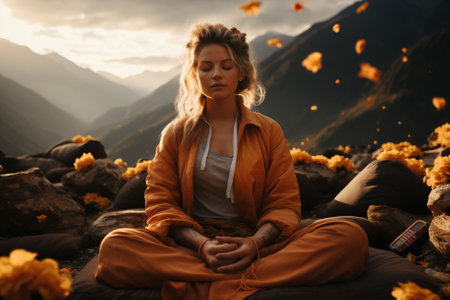 An AI generated illustration of a Serenity: Woman Meditating Amidst Mountain Majesty