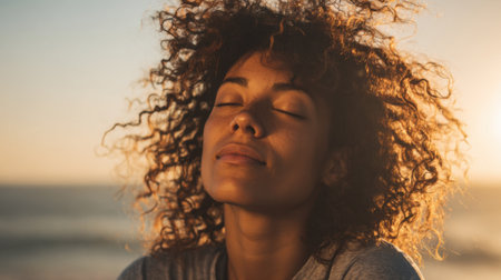 A woman with curly hair experiences tranquility at the beach as the sun sets. She breathes in the fresh air with a serene expression, embracing the moment of peace.