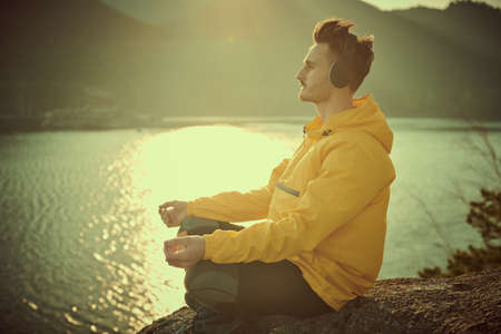 Man in yoga meditation pose sitting on a rock stone shore above the sea taking deep breath relaxing at sunset blue sky and sea on background. Find harmony and balance enjoying freedom, nature concept