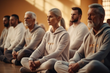 A gym instructor leading a group of seniors in a relaxing yoga class, promoting fitness and well-being in a bright, serene studio setting.