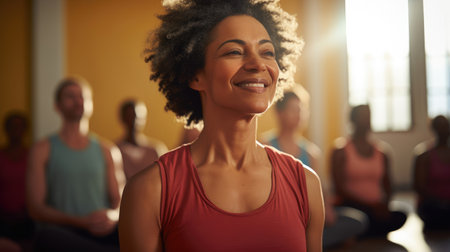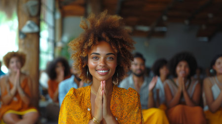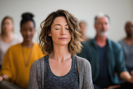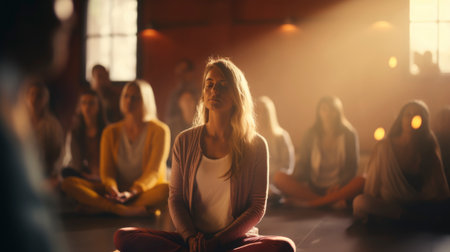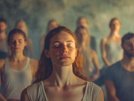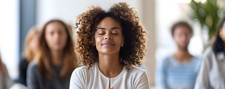A serene young woman with eyes closed practices meditation during a group wellness session, focusing on mindfulness and inner peace. warm sunlight illuminates her face, conveying tranquility and relaxation.