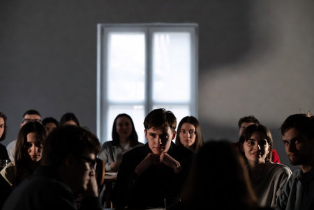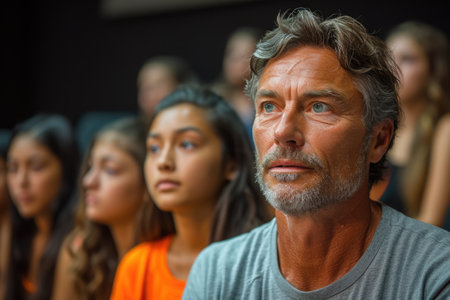 An attentive mature man among a group of viewers in a television studio, with a focused expression, reflecting the intensity of the live performance.