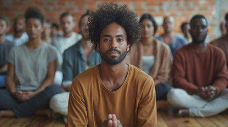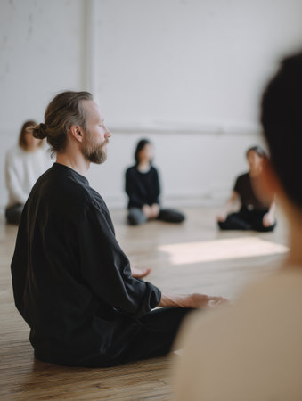 Man with long hair and beard leading a meditation session, sitting in a calm cross legged pose on a light wooden floor with other diverse participants in a peaceful wellness studio