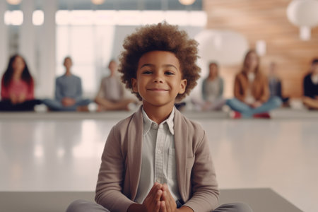 Portrait of a smiling African-American boy sitting in lotus position during yoga class