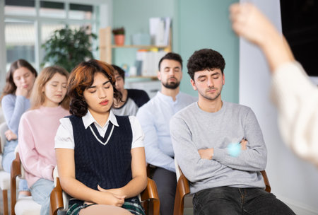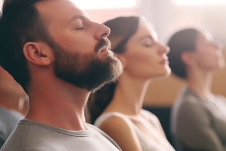 Practicing mindfulness and deep breathing for mental health and stress relief: A diverse group meditating in a studio. Concept Mindfulness, Deep Breathing, Mental Health, Stress Relief