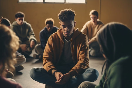 Everything will be alright Group of young people sitting in circle while one man holding head in hand and looking upset while young woman comforting him : Generative AI