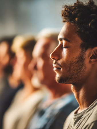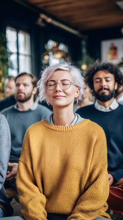 A group of diverse people, all with their eyes closed, meditating together, AI-generated.