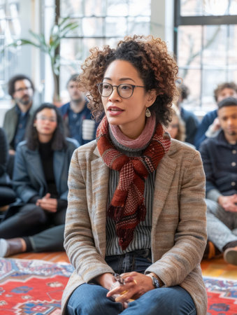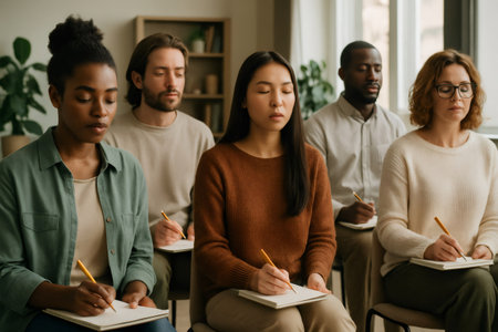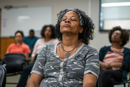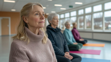 Participants engage in a mindful meditation session indoors at a community center during a winter afternoon. Generative AI